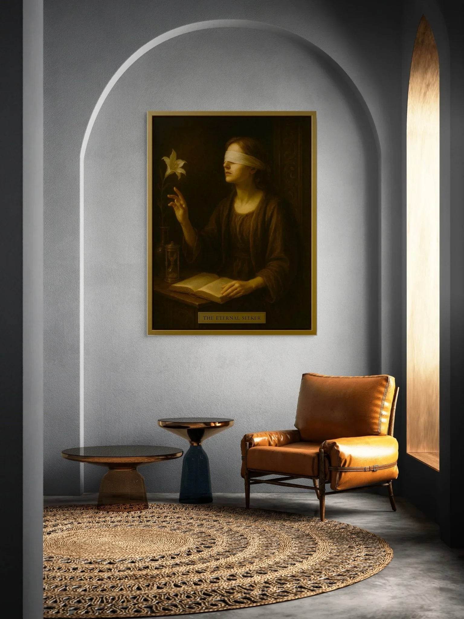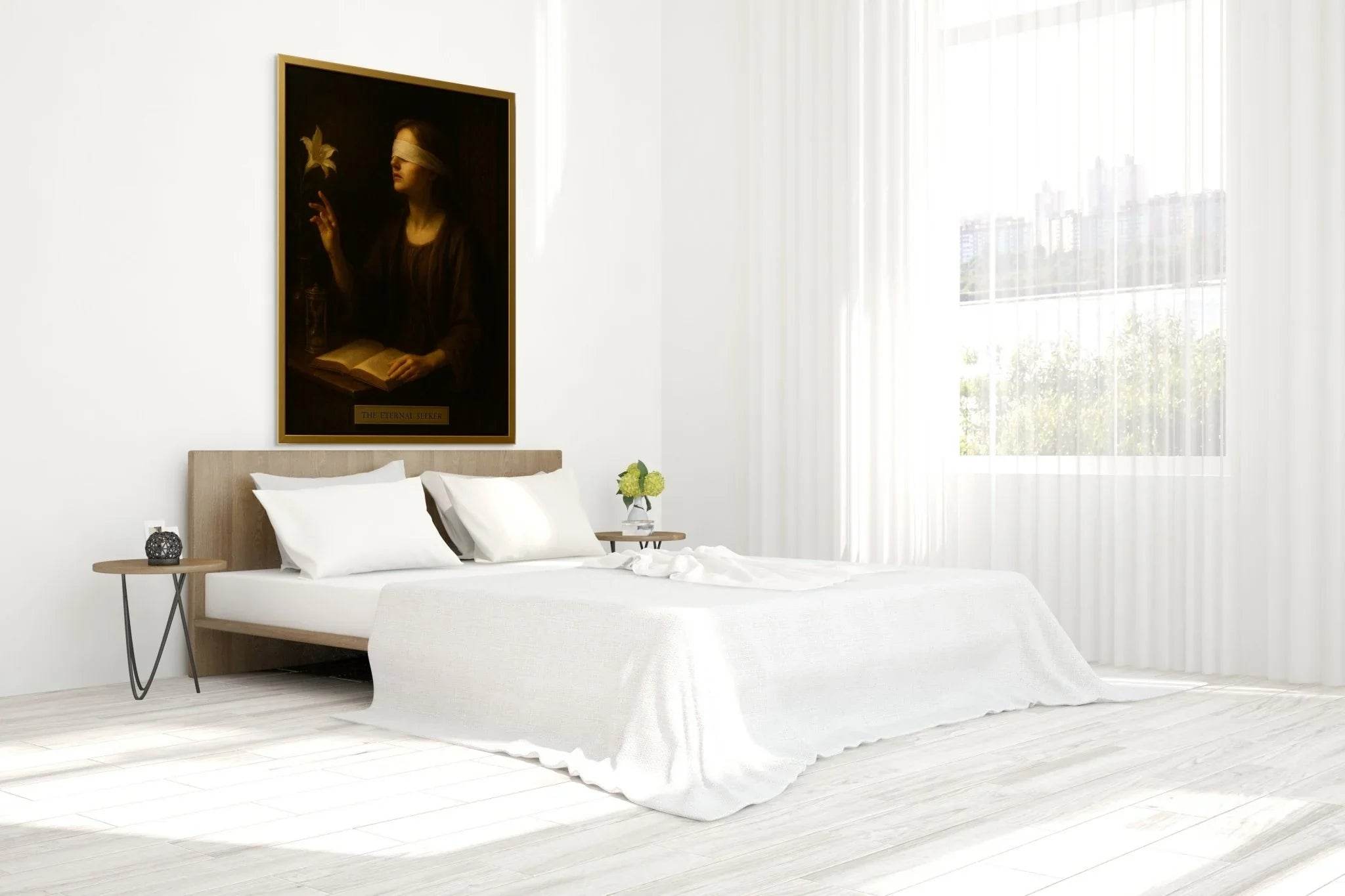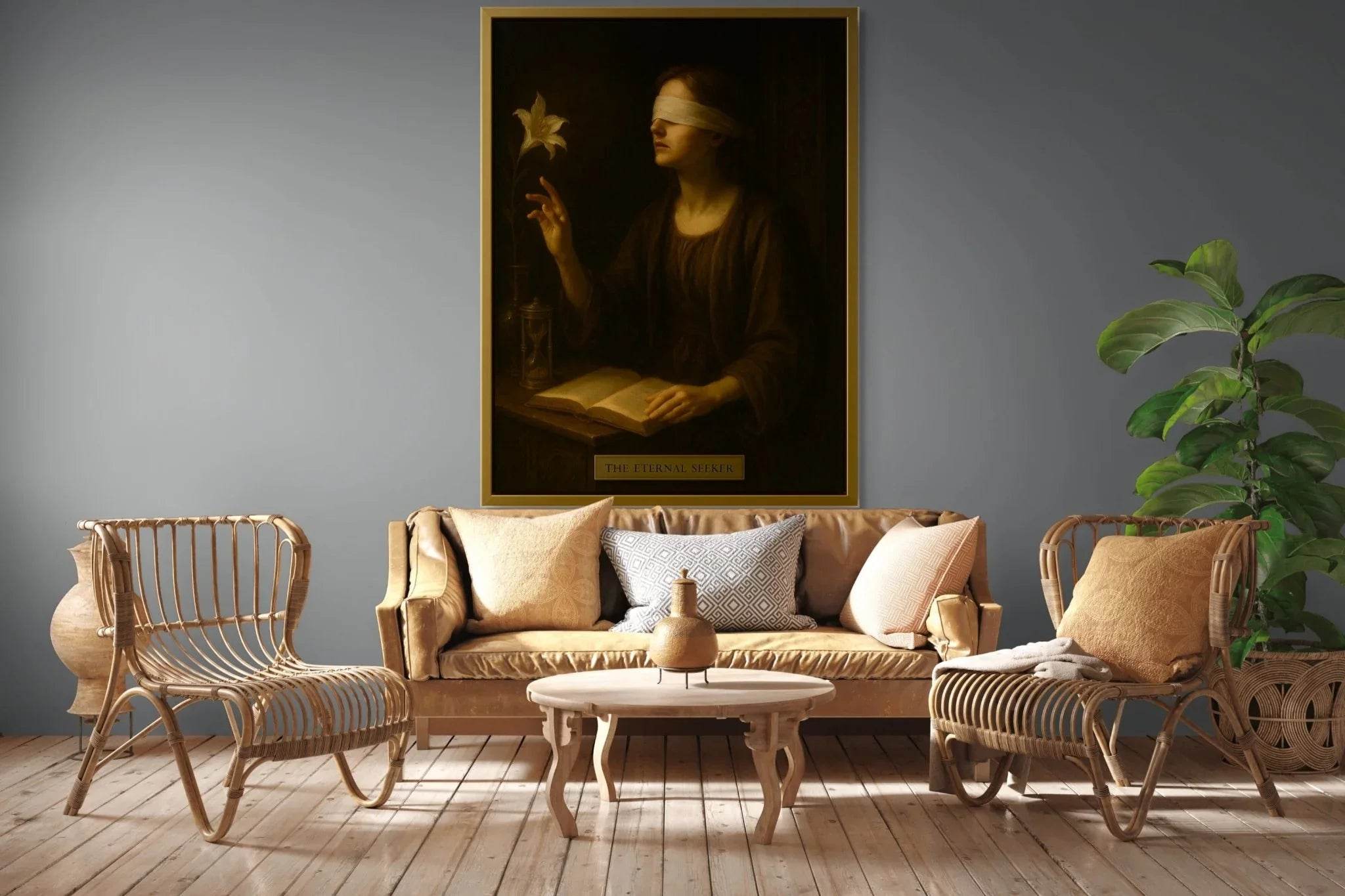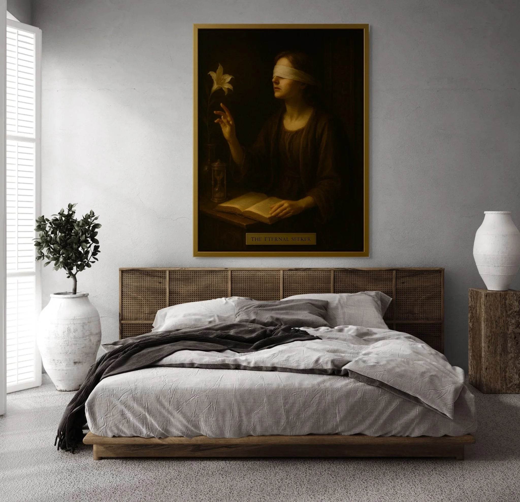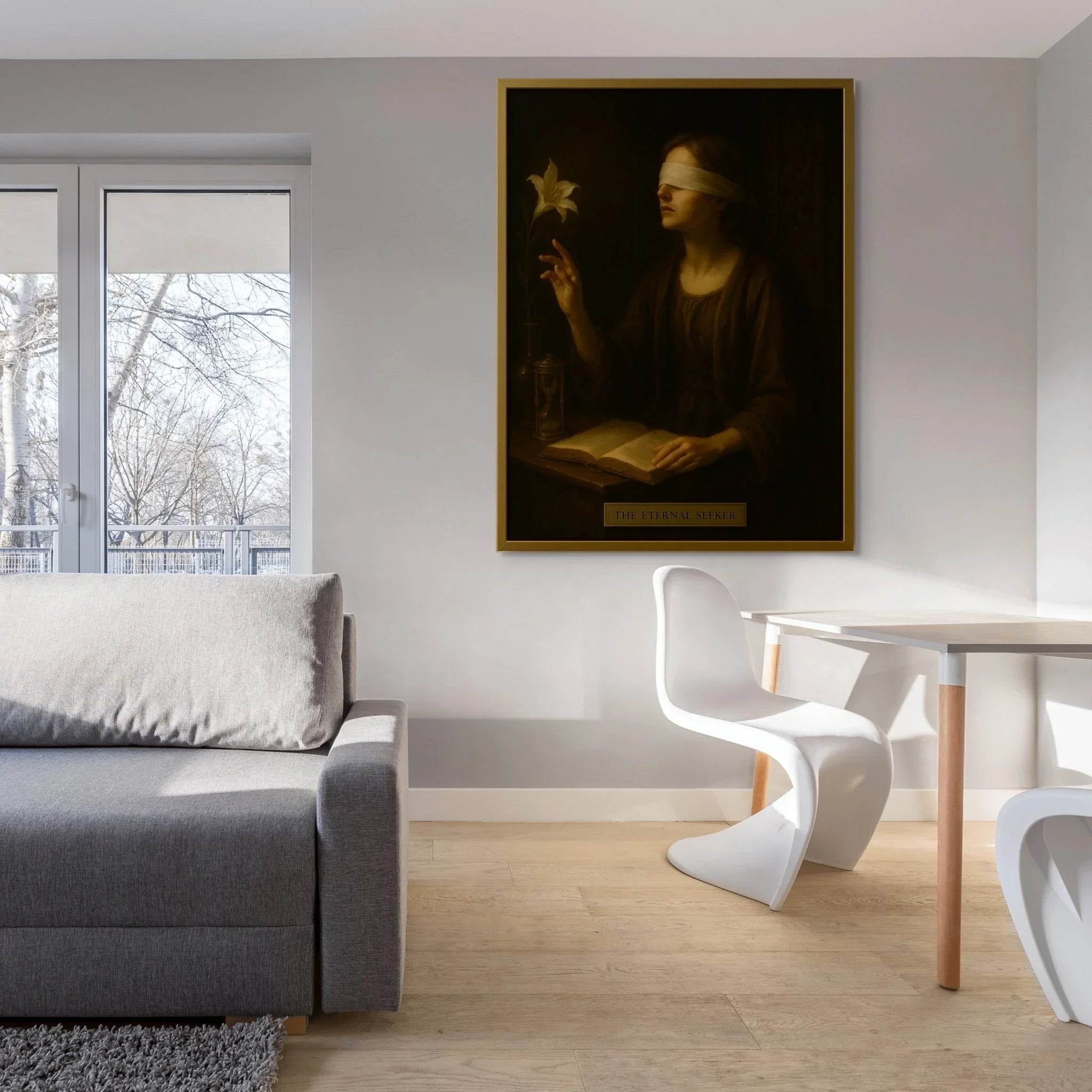 Transform your walls into a sanctuary of meaning and beauty with The Eternal Seeker by Liyah Vision. More than just wall décor, this masterpiece captures the eternal human quest for truth and light. A blindfolded figure reaches toward a delicate white lily, framed by golden illumination — a symbol of purity, wisdom, and transcendence.